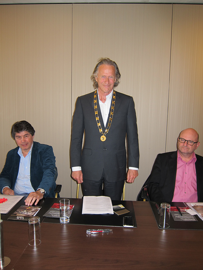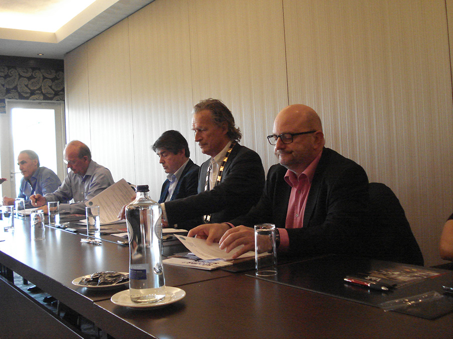 Gold chained ISO president Tony Kramps opening the AGM. To the right, Winfried Lambertz, left, Hans Haacke, Bob Garton and Eric Klinkers. |